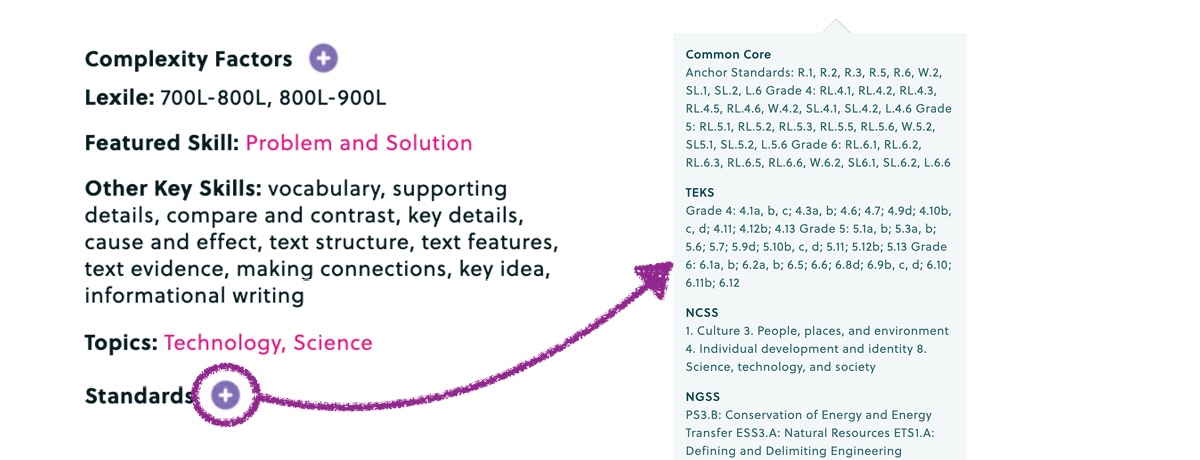 We list our standards correlations in various ways, so you can go on a deep dive into how Storyworks aligns with your state’s standards or have the standards for a specific story at your fingertips to pop into a lesson plan.